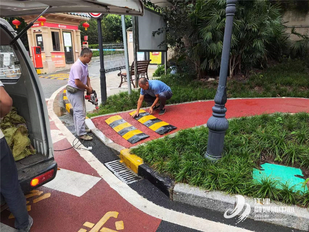 原来,恒碧社区工作人员入户走访时发现,恒大金碧天下小区大门旁的人行步道虽然具有防滑性,但是有一个小小的坡度,群众雨天步行走得快了容易“刹不住车”滑倒或冲到公路上。为了保障群众安全出行,社区立即组织人员进行全面排查,在明确减速带的安装位置及数量后,迅速组织专业施工人员安装减速带。现在,居民们走到这里,看到这道减速带,脚步就会不自觉地就慢下来,特别是使用婴儿推车、儿童滑板车时多了一重安全保障。