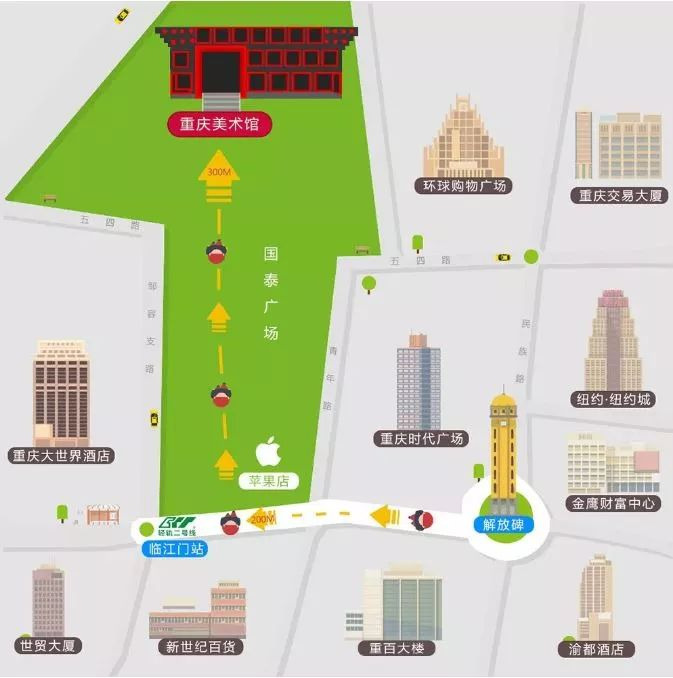 路线指引:重庆美术馆正大门距离解放碑约500米(如下图),紧邻轨道交通2号线“临江门”站。从“临江门”站D出口右转到达国泰广场后沿着梯级向上约200米即可到达美术馆入口。