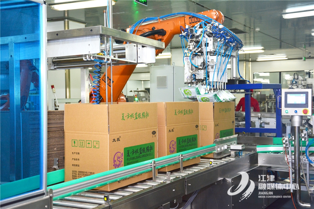 创新引领,向智能化生产要产能。太极中药二厂注重新技术、新设备的开发和利用,在推进提升生产能效、高效利用资源、清洁化生产等方面做出多项创新。通过自行研制机器人淘药和自动投料装置,太极中药二厂完成了前处理车间数字化转型,达到了车间24小时连续作业、产线员工减少、产品质量提升、灰分减少30%的效果,成功解决了中药原材淘洗和投料存在的诸多问题。在生产工艺上,太极中药二厂自行研制湿法制粒设备并顺利投产,工作效率提升20%,实现了复方板蓝根颗粒、感冒清热颗粒和玄麦甘桔颗粒等明星药品高效、清洁、高质量生产。