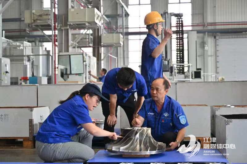 在重庆江增船舶重工有限公司生产车间,各条生产线开足马力、全力运转。门式起重机在车间上方往来穿梭,精准地将原材料和半成品送达指定位置;技术人员手持图纸,脚步匆匆地在生产线间来回穿梭;工人们熟练地调试着数字化设备,确保每一个加工零件精准无误;质检员们一丝不苟地检查着产品,不放过任何一个细微瑕疵……整个车间呈现出热火朝天的生产景象。