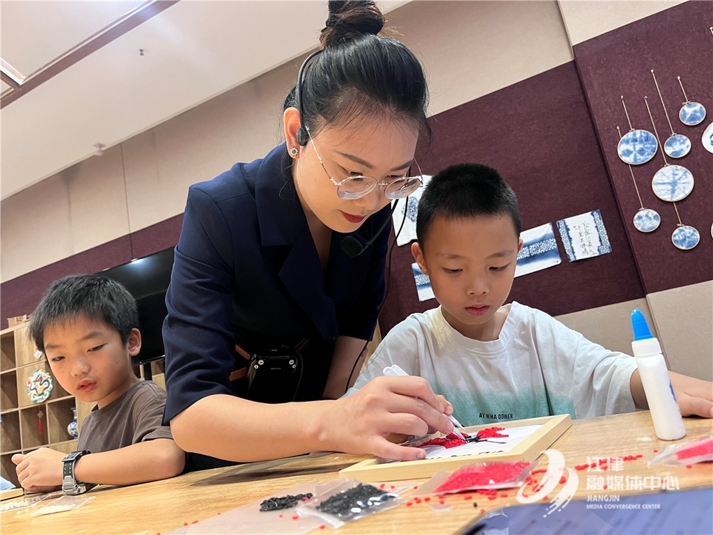 10月1日当天,10名小学生来到江津博物馆社教区,在手工老师的帮助下,手拿镊子,将一颗颗颜色各异的谷物,耐心贴在画上。活动中,学生们学习并体验五谷粘贴画这一传统民间艺术,感受劳动人民的智慧与“粒粒皆辛苦”的珍惜之情。