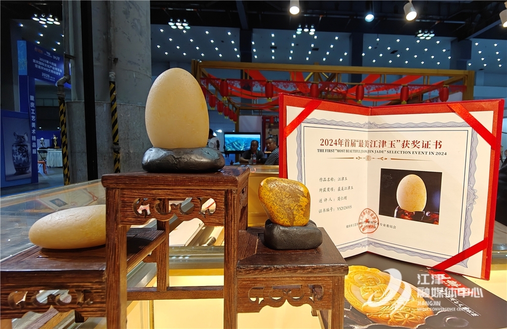 此外,经权威评审,50 件 “最美江津玉籽玉” 从 800 余件参评原石中脱颖而出:所有获奖籽玉均凸显 “皮壳完整、色泽温润” 的优质特质,充分展现江津玉籽玉的天然魅力,已于展场核心区专位陈列,供观众近距离品鉴收藏。